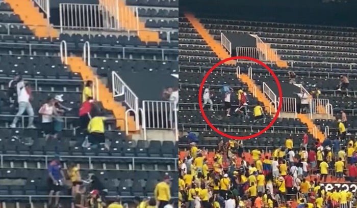 En las imágenes se puede ver que varios aficionados de Colombia pelearon entre ellos y empezaron a lanzarse algunos objetivos como las sillas del estadio, lo que demuestra que dañaron la estructura del escenario deportivo.