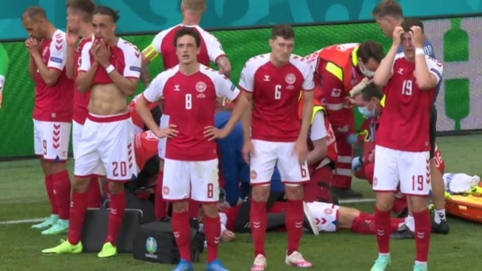 Eriksen cayó al césped inconsciente, sin motivo aparente, y, tras varios minutos en los que precisó asistencia médica urgente, fue retirado del terreno de juego en camilla rodeado por los jugadores daneses.