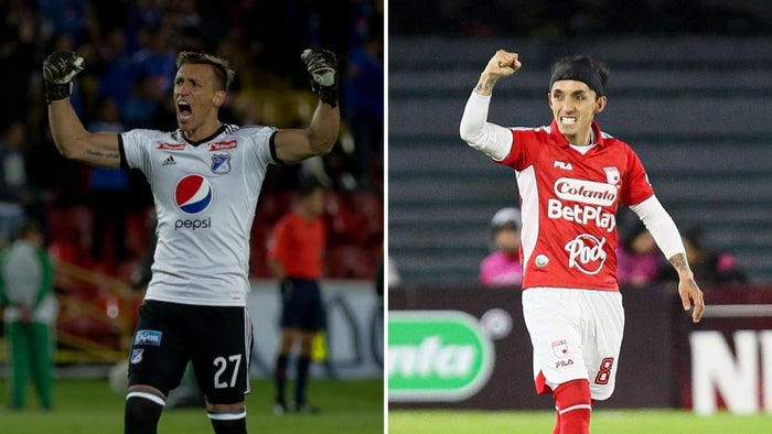 Nicolás Vikonis con la camiseta de Millonarios y Omar Frasica con la camiseta de Santa Fe