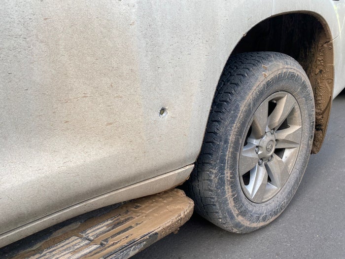 “El día de hoy sobre las 5:30 de la mañana estaba saliendo entre límites de ciudad Bolívar y Soacha y fue cuando una motocicleta se nos pega y posteriormente somos impactados. Cuatro impactos tiene el vehículo”, expresó.