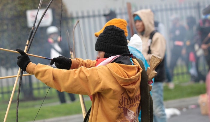 La situación escaló al punto que, en medio de la refriega, los manifestantes respondieran con algo más que piedras a los gases lacrimógenos, el agua a presión y las balas de goma de la Fuerza Pública. En algunos videos captados por RCN Radio en el lugar de los hechos se evidencia que algunos portaban arcos largos y flechas, y no se descarta el uso de otros objetos contundentes como lanzas.