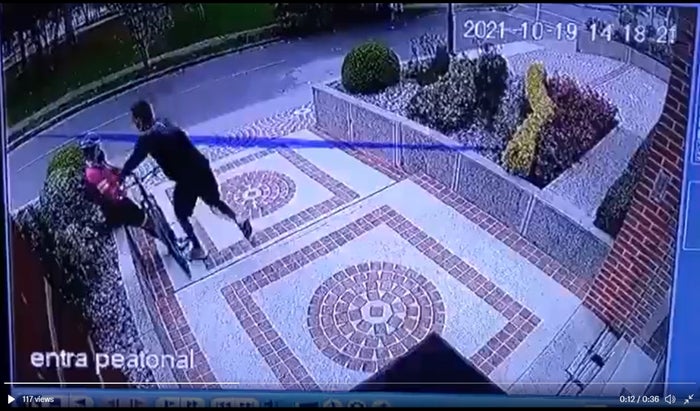De inmediato, el celador se percata de la situación y mientras la víctima grita y señala al ladrón, el vigilante sale a observar lo ocurrido.