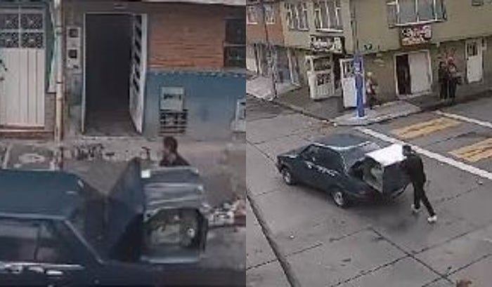 El hombre abre el baúl del carro, y al ver que este artículo de cocina no ingresa de manera correcta, decide sostenerla, mientras su cómplice trata de ayudarlo. En un momento, el carro comienza a rodarse, por lo que el otro delincuente, toma el control, mientras que el sujeto que ‘enredó’ a la señora sostiene la estufa y sale corriendo con el carro.