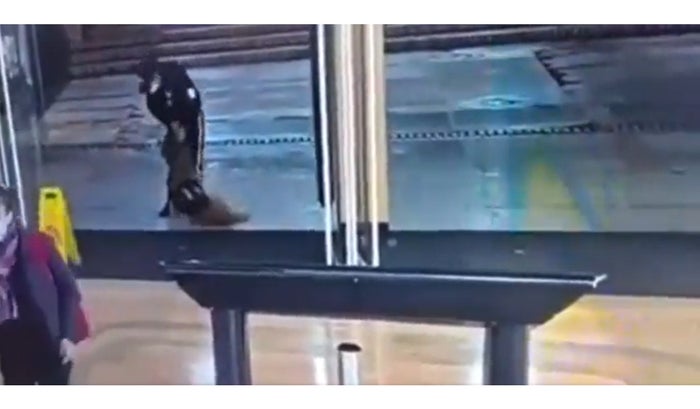 Ante la mirada de la gente, el hombre intenta disimular que nada está pasando y su perro esta recostado, pero cuando se da cuenta que no hay personas alrededor, el sujeto vuelve a alzar a su can bruscamente y lo arrastra hacia un costado, todo esto quedó registrado en las cámaras de seguridad de la entrada al centro comercial.