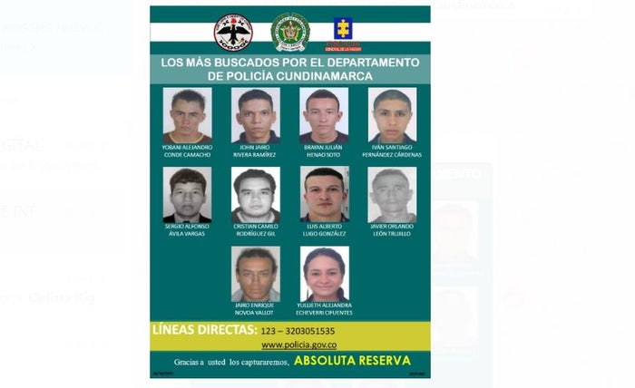 “Tenemos recompensas por hasta 10 millones de pesos por cada uno de estos delincuentes por eso hacemos un llamado a la ciudadanía para que nos informe sobre el paradero de estos delincuentes llamando a la línea 123 con absoluta reserva”, dijo el gobernador de Cundinamarca Jorge Rey.