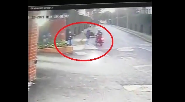 Uno de los hombres portando un maletín de una de las tantas empresas que ofrece el servicio de domicilio, se baja del bólido y acorrala al ciudadano apuntándolo con una pistola. Luego de hurtarle varias de sus pertenencias, corre hacia el vehículo de dos ruedas, se sube y emprende la huida con su compañero de fechorías.