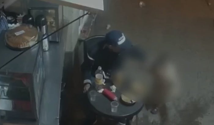 En las grabaciones se puede ver que luego de hacer el pedido de comida a la señora que atiende su local, el agresor se sienta mientras que la niña permanece de pie muy cerca de él.