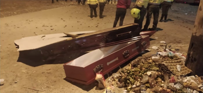 Los manifestantes se metieron al local de venta de ataúdes y sacaron varios para utilizarlos como escudos contra los efectivos de la fuerza pública.