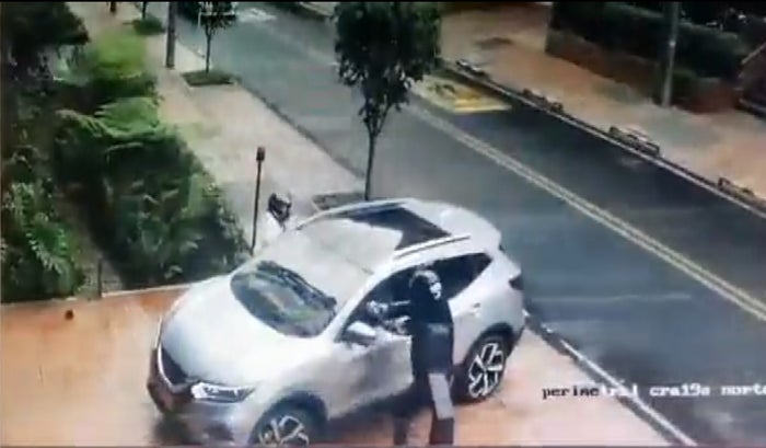 En el video se observa que el automóvil donde se transportaban los ciudadanos espera a la entrada de un edificio para ingresar. En ese instante llegan dos fleteros en moto que se bajan detrás del vehículo; acto seguido, otra moto con otros dos sujetos también llega al lugar.