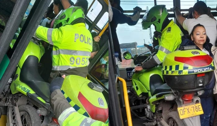 En esta ocasión, los protagonistas fueron dos agentes de la Policía Metropolitana de Bogotá, que se vieron envueltos en una polémica, pues en fotografías que registraron algunos ciudadanos, se ve como los uniformados ingresan una motocicleta de la institución a una ruta alimentadora del sistema.