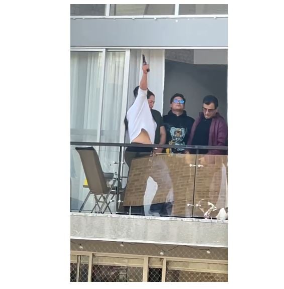 Pantallazo de video tomado de @RCn Radio Mujer disparando al aire desde un balcón en Bogotá.