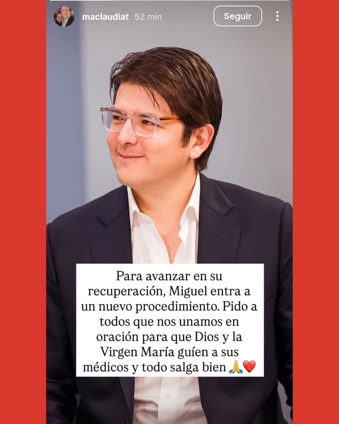 "Para avanzar en su recuperación, Miguel entra a un nuevo procedimiento. Pido a todos que nos unamos en oración para que Dios y la Virgen María guíen a sus médicos y todo salga bien", expresó Tarazona en una historia publicada en Instagram, acompañando sus palabras con una imagen del precandidato presidencial.