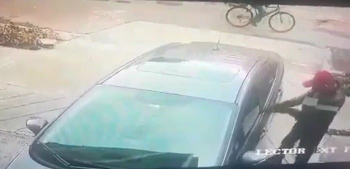 Una cámara de seguridad grabó el aterrador momento en el que un hombre con arma de fuego se acerca hasta un vehículo particular y comienza a golpear la puerta del conductor, pero al ver que la víctima no bajaba el vidrio, le dio un disparo para romper el cristal.