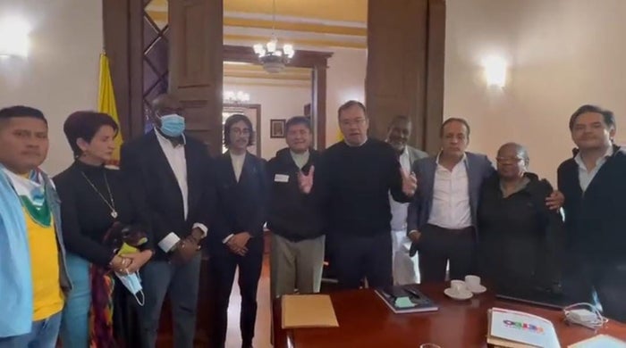 En su llegada a la capital, se reunió con el ministro del Interior, Alfonso Prada, quien en compañía de un representante de la iglesia católica y de parlamentarios, le dio la bienvenida al alcalde del puerto al comité cívico.