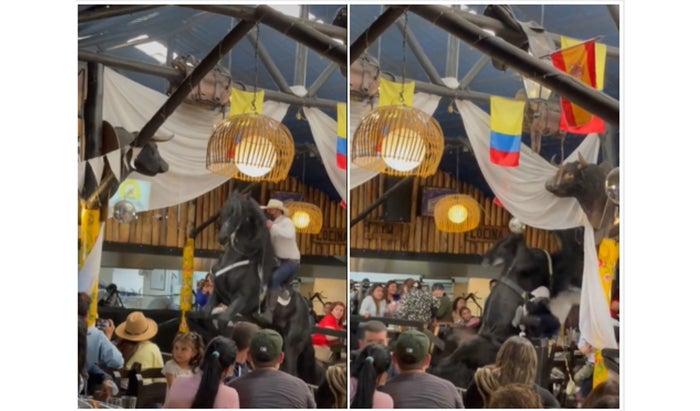 Las imágenes publicadas por la cuenta de Twitter Colombia Oscura, muestran cómo el equino está en un popular 'show' de exhibición de paso en la hacienda Las Margaritas, en un espacio reducido y rodeado de mesas y sillas del lugar.
