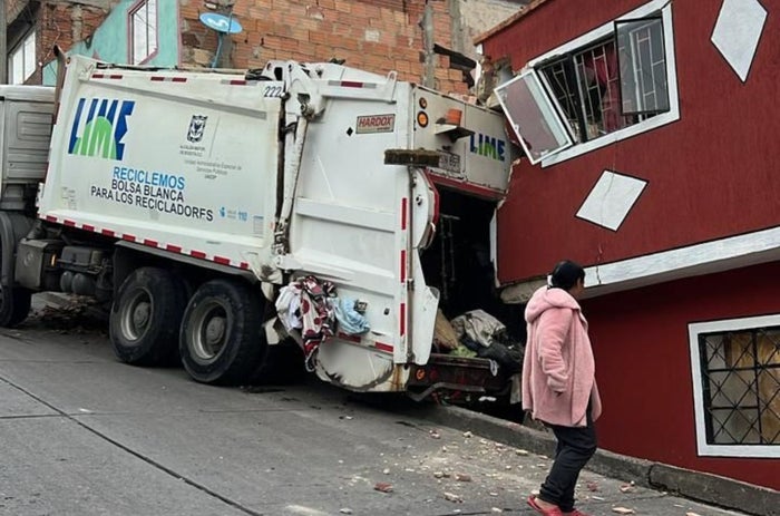 El choque ocurrió en la intersección de la carrera 18a con la calle 67 Sur y la magnitud del impacto ha provocado daños considerables tanto en el camión recolector como en la vivienda afectada.