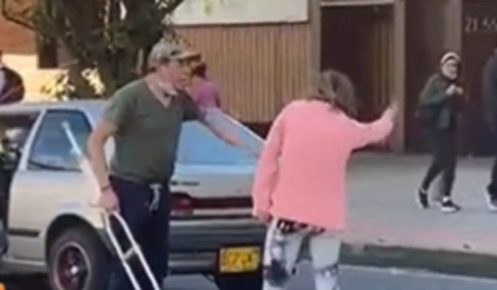 En ese momento, aparece un ciudadano que trata de defender a la mujer, y se enfrenta contra el señor que sostiene la muleta y la utiliza para golpearlo, pero él logra defenderse con una tonfa que tiene en su poder.