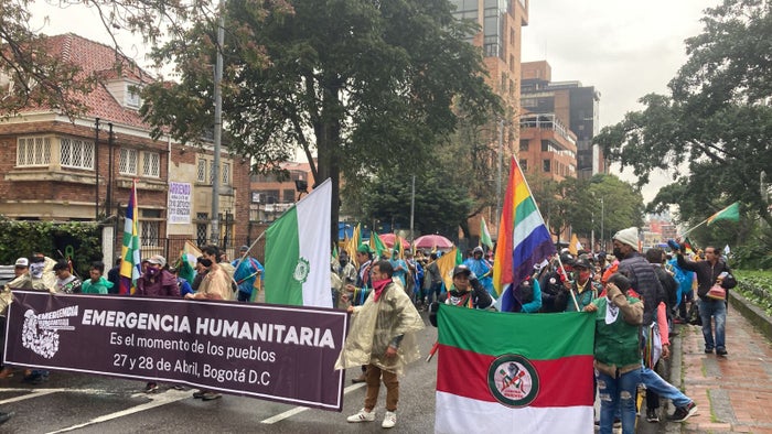 Luego partieron por la Carrera 11 hacía el sector de Lourdes. La sede de la Defensoría del Pueblo fue el punto final de encuentro, allí con música, arengas como “fuerza, fuerza, pueblo, pueblo”, entre otras, banderas que representan sus comunidades y con mucho color expresaron pacíficamente su necesidad de ser escuchados.