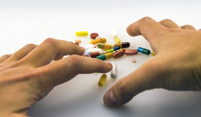 Las manos de un hombre queriendo agarrar varias pastillas