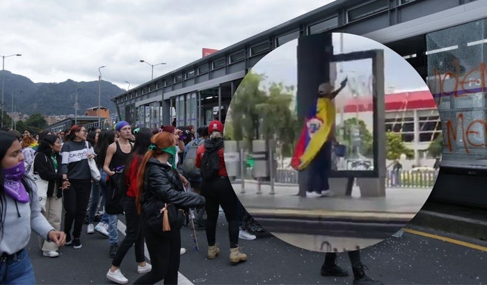 Mientras se desarrollaba la manifestación, algunos encapuchados no se conformaron solo con bloquear las vías, sino que también quemaron llantas y decidieron grafitear la estación de Transmilenio y algunas paredes.