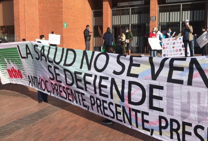 Varios médicos y enfermeras en Bogotá protestan frente a la Secretaría de Salud para exigir mejores condiciones laborales para atender la pandemia.