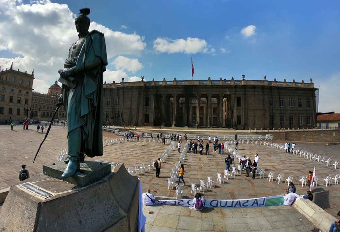 Con 165 sillas blancas vacías, cada una con una flor y una cinta negra con los nombres de médicos, enfermeras, auxiliares, camilleros, conductores y personal administrativo del sistema de salud que ha muerto por covid 19, se realizó en la Plaza de Bolívar un acto simbólico en homenaje a estas personas que dieron su vida para atender la pandemia.