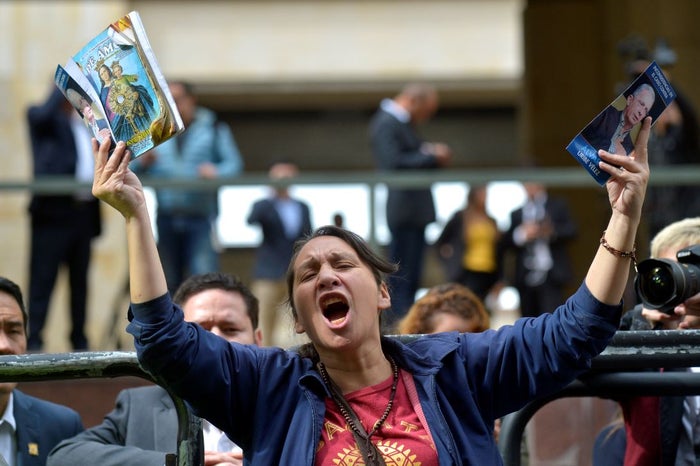 "¡Qué viva!", expresó la monja de forma airada y luego sus acompañantes la siguieron en coro ante la mirada de decenas de periodistas que cubren la indagatoria y de decenas de policías que fueron desplegados en la zona céntrica de Bogotá para evitar desmanes.