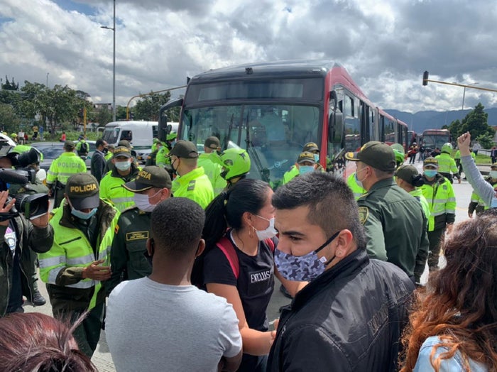 Las manifestaciones no solo se dieron en este punto. Un poco más temprano iniciaron una serie de protestas en el sur de Bogotá sobre la NQS, que obligaron al cierre de las estaciones Sena, NQS 30 Sur, NQS 38 A Sur y la estación General Santander, donde los comerciantes lanzaron diferentes elementos al carril de Transmilenio para pinchar las llantas de los buses.