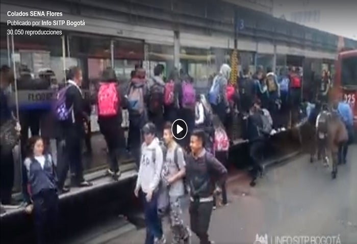 En rede sociales anda circulando un video en el que una importante cantidad de estudiantes del Sena, aparentemente de la sede calle 63 con carrera 13 en Chapinero, se cuelan en la estación de Transmilenio de Flores, por una de las puertas de abordaje a los articulados.