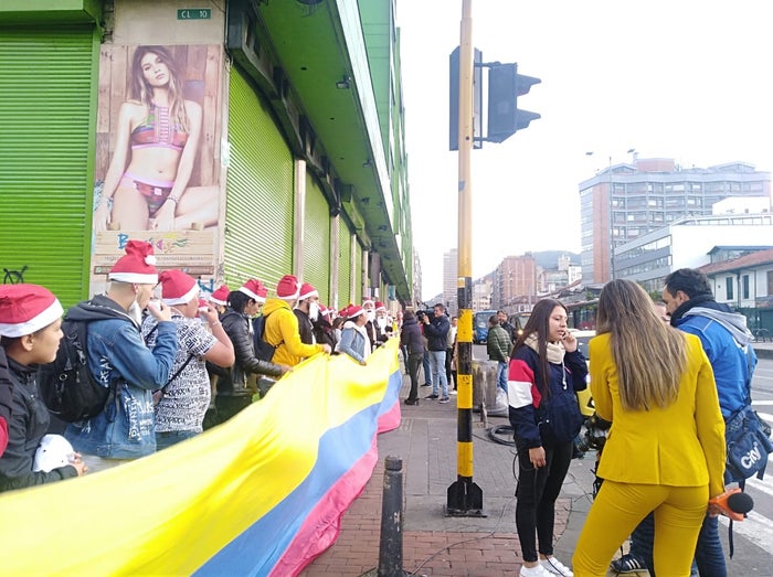 Cerca de 200 comerciantes del tradicional 'Gran San', en el sector de San Victorino (pleno centro de Bogotá), madrugaron este martes para realizar una 'cadena humanitaria' en contra de las manifestaciones anunciadas para este miércoles. Entre arengas, vestidos de Papá Noel y con una gigante bandera de Colombia gritaban "dejen trabajar".