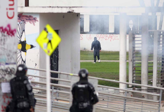 Encapuchados e integrantes del Escuadrón Móvil Antidisturbios (Esmad) de la Policía Metropolitana de Bogotá se enfrentaron en las inmediaciones de la Universidad Nacional, durante las más recientes protestas convocadas por estudiantes y centrales trabajadoras.