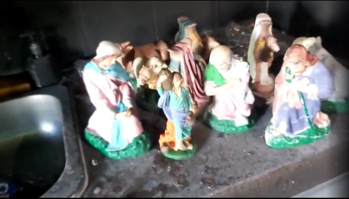 El policía que se encontraba grabando el video, reportó los destrozos que sufrió el sitio; sus vidrios completamente rotos y al interior todo quemado menos unas siete figuras religiosas que se encontraban en buen estado.