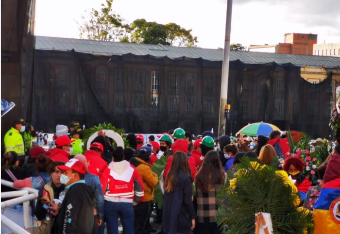 En la Plaza de Bolívar un grupo de por lo menos 50 personas realizó un plantón, mientras se realizaba la sesión de moción de censura en el Congreso de la República contra el ministro de Defensa Diego Molano por los hechos en los que varias personas han muerto en desarrollo de las protestas que se registran en el país desde el mes de marzo.