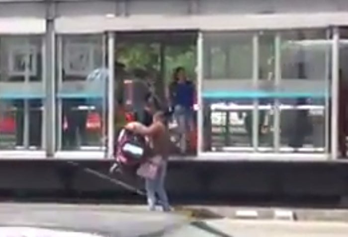 En la grabación se observa a la mujer en un separador en plena Autopista Sur, esperando que los articulados que pasan por esta avenida se alejen para entonces cargar con el coche y meterlo por la puerta de una estación de Transmilenio.