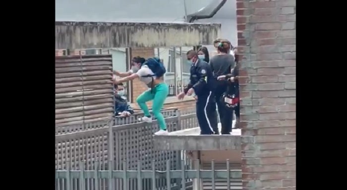 En un video difundido en redes sociales se observa el momento en que los trabajadores suben hasta una de las terrazas de la entidad y, en un acto peligroso, dan largos saltos o brincos para pasar a un edifico cercano y poder salir.
