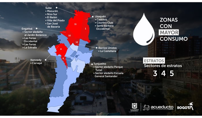 En 16 zonas de seis localidades de la ciudad se registran niveles de consumo significativamente superiores a la media. Suba es la localidad con mayor número de sectores con derroche de agua, especialmente en Mazurén, Niza Sur, El Betán, Villa del Prado y San José de Bavaria.
