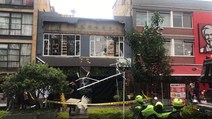 El techó de la fachada de un establecimiento comercial en la carrera 24 con calle 41, sector del Park Way, en Bogotá, colapsó, al parecer, por las fuertes lluvias que cayeron en las últimas horas.