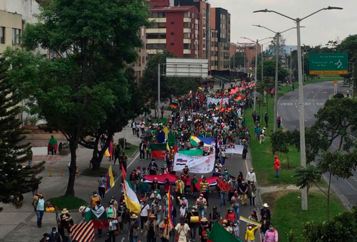 La multitudinaria caravana de indígenas que recorrió cerca de 500 kilómetros en los últimos cuatro días y que llegó el domingo a Bogotá, ya recorre las principales vías de la capital para arribar a la Plaza de Bolívar, el corazón de la democracia en Colombia.