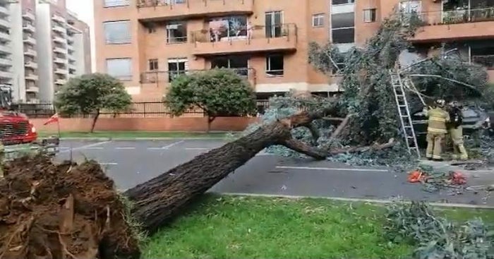 "Bomberos de la estación de Puente Aranda realizan el corte y trozado de un árbol que cayó sobre un vehículo en la carrera 68 con calle 25. Se asegura el área, hay paso vehicular lento por lo cual se recomienda tomar vías alternas", dijo Bomberos Bogotá.