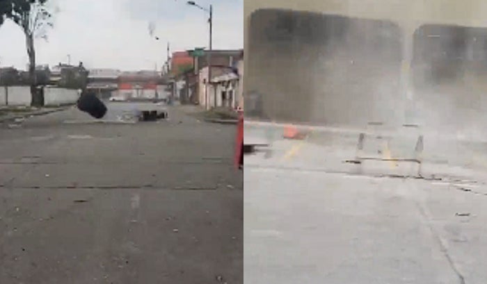 Tejas, contenedores de basura y residuos como bolsas de plástico se elevaron pro la fuerza del viento y recorrieron las calles que están por detrás de los juzgados de Paloquemao durante varios minutos.