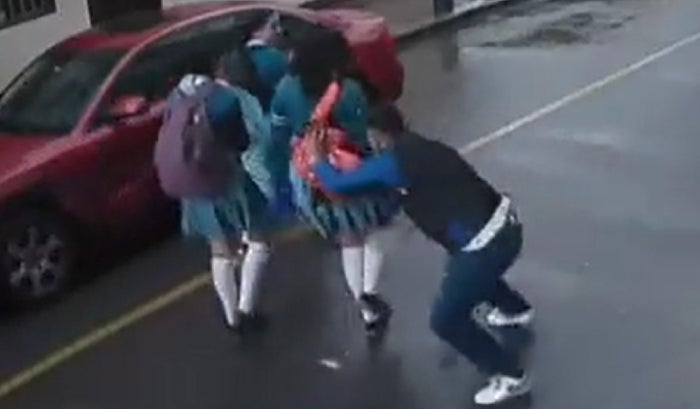 En redes sociales circuló un video donde se observa que un ladrón desciende de un vehículo particular y le jala sus pertenencias a unas estudiantes del Colegio Francisco José de Caldas de Bogotá.