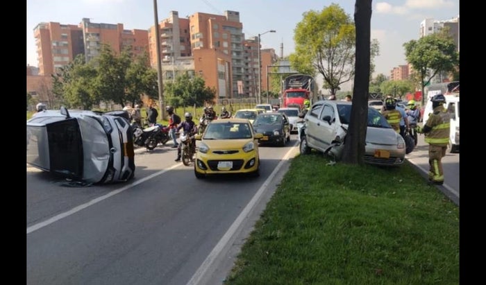 A la compleja movilidad de Bogotá se sumó en la mañana de este jueves 18 de noviembre un siniestro vial que dejó un carro volcado, una motocicleta chocada y otro automóvil estrellado contra un árbol.