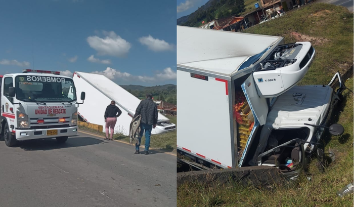 Un vehículo de carga tipo furgón, que circulaba por esta carretera, perdió el control y terminó volcando en un box culvert, quedando atrapado su único ocupante dentro de la cabina.