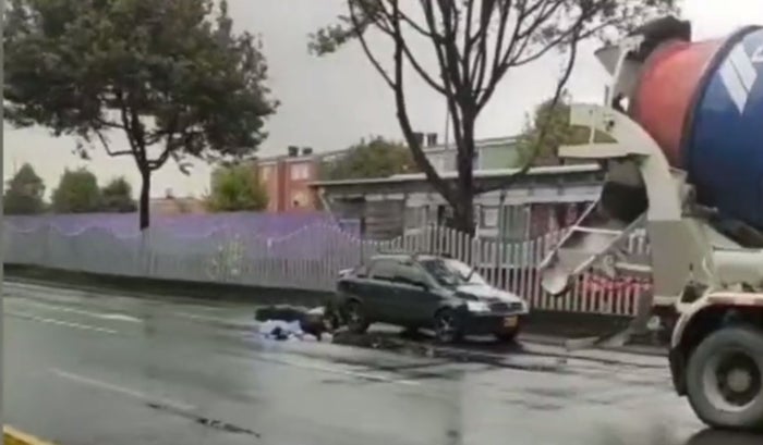 El hecho quedó registrado en un video que circuló por redes sociales, en el que efectivamente se observa un camión con mezclador de placas WMZ 765 de Funza. Detrás de él hay vehículo marca Nissan y al final se ve la motocicleta totalmente destruida.