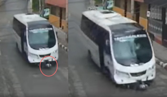 En las imágenes se puede ver como un bus de transporte público va bajando a toda velocidad por una calle empinada cuando coge a un motociclista que queda atrapado en la parte de adelante debajo del bus y es arrastrado durante, al menos, 200 metros.