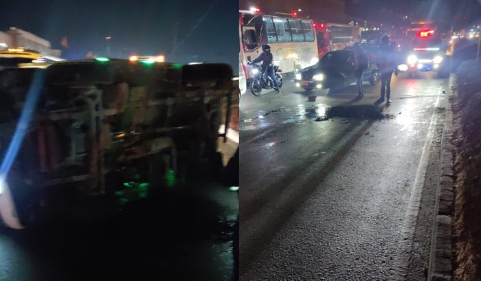 Según el reporte de las autoridades, el accidente se produjo alrededor de las 8:35 de la noche, cuando el camión, que transportaba materiales de construcción, perdió el control y se volcó sobre el costado izquierdo de la vía.