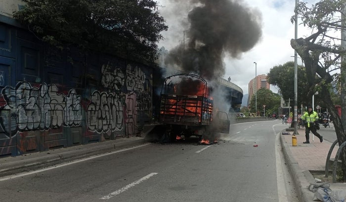 Como se puede ver en las imágenes, se trata de un camión de estacas que se encendió justo cuando giraba para tomar por la glorieta rumbo a la Ciudad de Villavicencio hacia el sur. El incendio ya fue controlado. Sin embargo, tenga mucho cuidado si trata de tomar por esta vía.