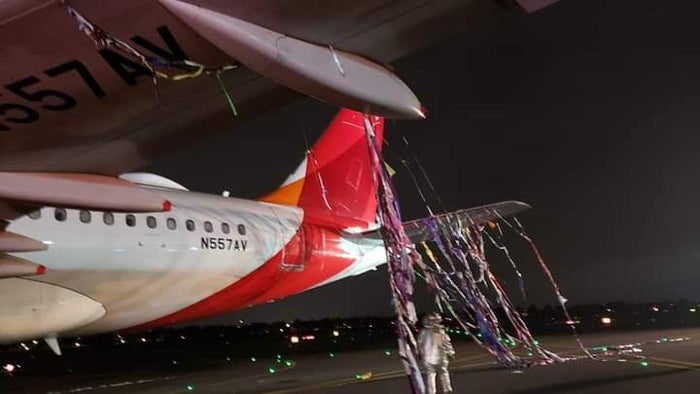 A través de redes sociales se compartieron imágenes que muestran que las alas de la aeronave, un Airbus A320 de matriculas N557AV, quedaron prácticamente enredadas en plástico, incluida la turbina izquierda.
