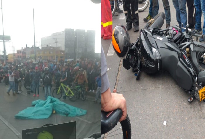 Los testigos de este hecho afirmaron que, tras el fuerte choque entre un camión de carga pesada y una motocicleta Pulsar NS 200 de placas CJG82F, el conductor de la moto quedó tendido en el piso.