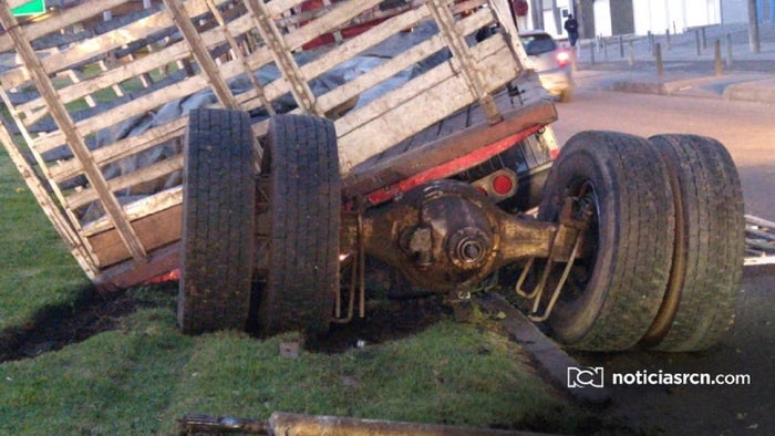 El vehículo se encuentra por la vía paralela a la autopista que es la que conecta con la Carrera 30 hacia el sur. Según reveló el conductor del vehículo de carga, quien resultó ileso, cuando transitaba por dicho lugar, un carro particular color gris, le cerró violentamente la vía, situación que lo llevó a perder el control de su camión.